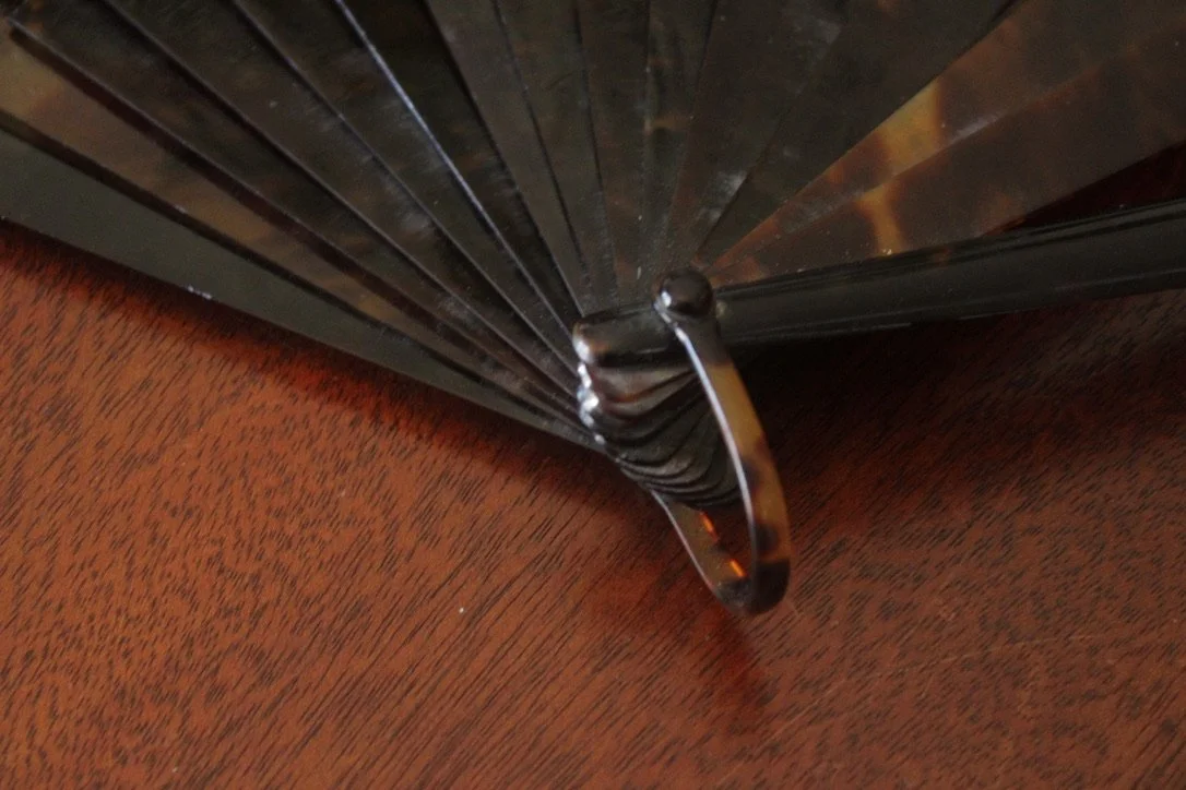 A 1900's antique ostrich feather hand fan in very good condition. The staves seem to be celluloid, in imitation of tortoise shell. The feathers are likely dyed, the staves are stitched together. One of them has a broken thread so not properly attached and the fan is shown pretty much fully open. The frame is monogrammed with a letter T.