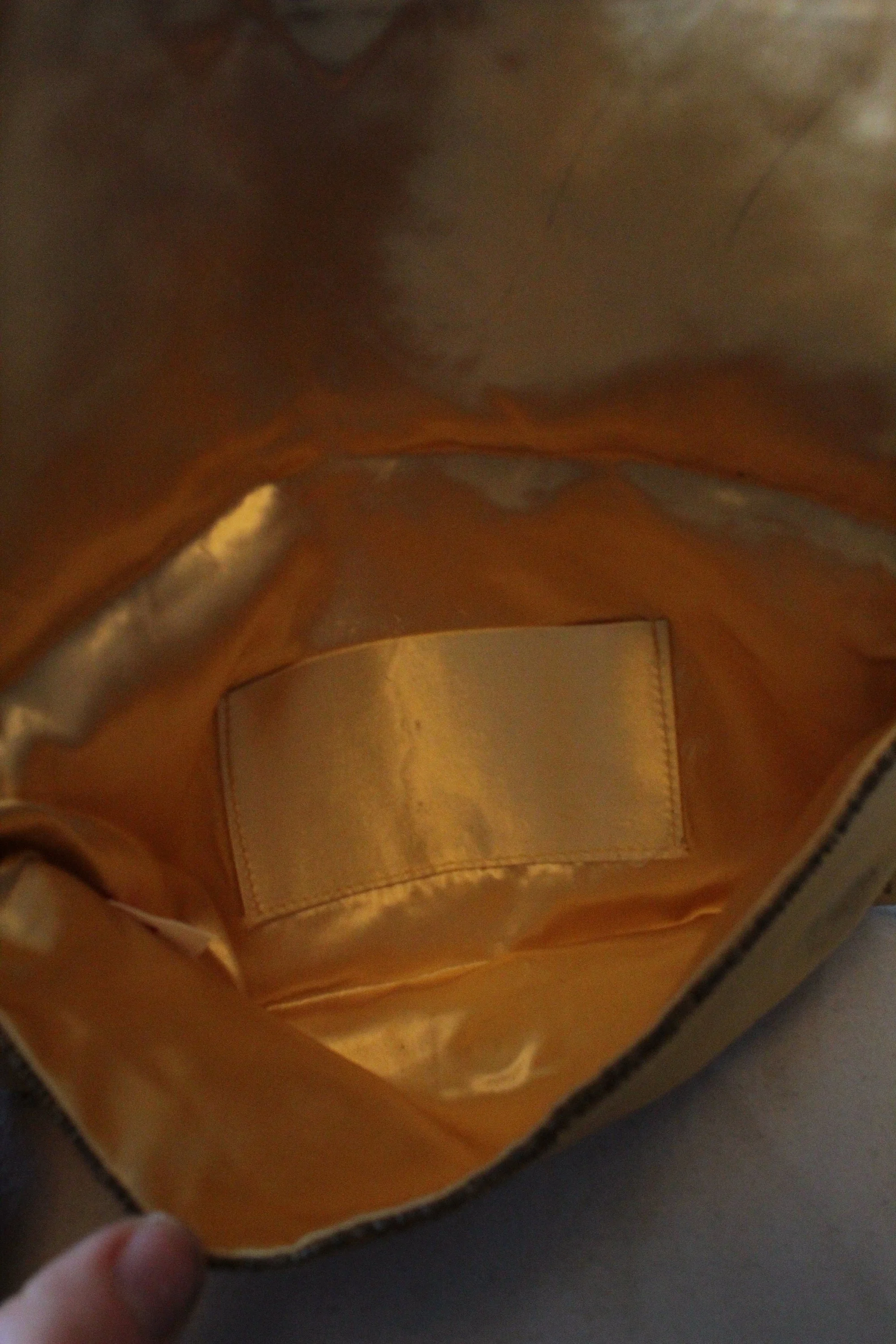 A 1960’s gold satin envelope clutch bag, with beading. The condition is very good, except for a small glue spot, likely from an old price tag.