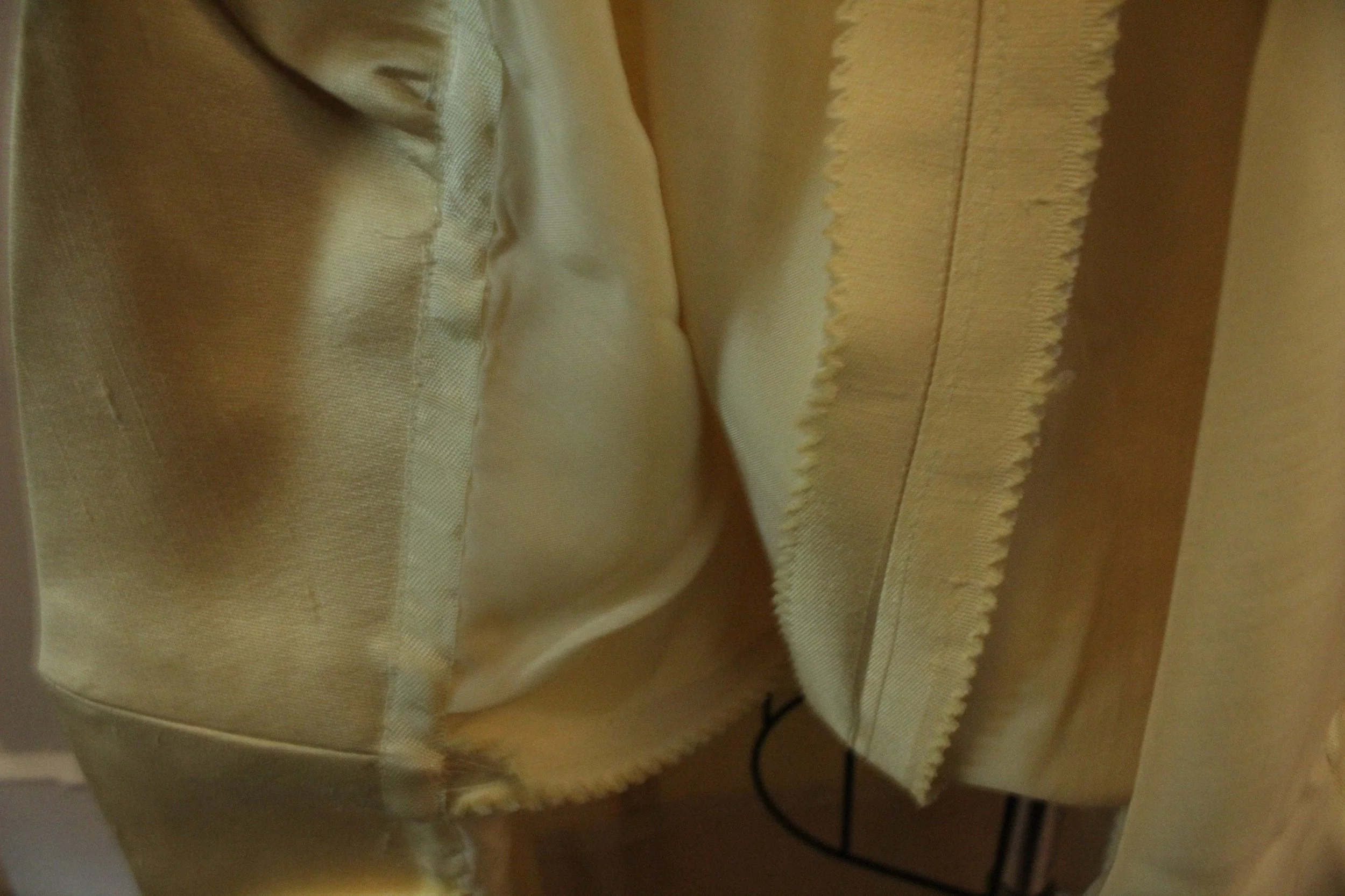 A 1960's pale yellow shantung evening gown, in very good condition. There has been some minor bead loss, the worst of which has been mitigated with mending. The top of the bodice is lined with sheer material, the rest of the dress is lined with more substantial yellow synthetic material. The hem is fairly wide, so the dress was likely shortened at some point.
