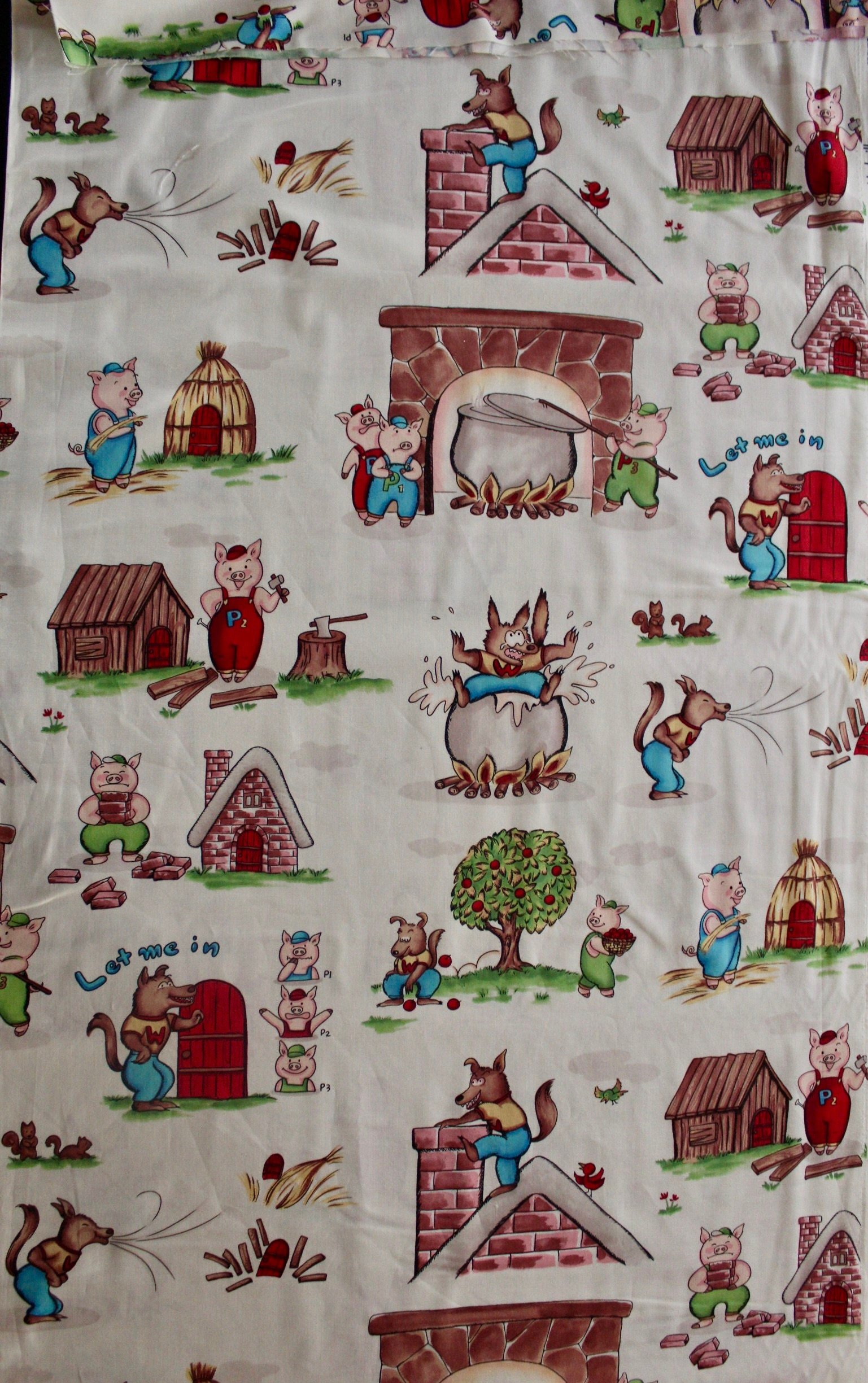 An out of print 1990s vintage Michael Miller three little pigs print quilting cotton fabric. The figures are 4-6" tall.